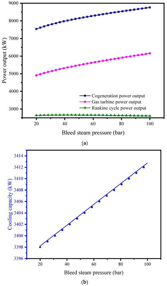 (a) Influence of the bleed steam pressure from the turbine on power produced with the turbines and the net-generated power; (b) influence of the bleed steam pressure from the turbine on refrigeration capacity.
