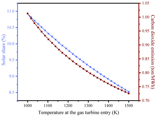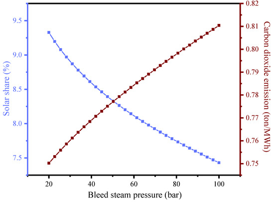The variation of carbon dioxide emission for one unit of generated electrical energy is shown in Figure 7, as is the contribution of solar energy to biomass fuel energy to provide the required heat. As the compression ratio increases, it is seen that the carbon dioxide EI decreases due to the decline in the exhaust gas mass flow rate. In addition, the solar share in supplying the required heat for the cogeneration system climbs with increasing compression ratios. In order to compensate for the reduced heat received in the HRSG to produce steam, solar energy provides a greater share.
