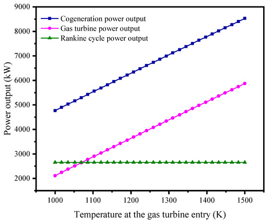 Figure 5 demonstrates the influence of compression ratio on the net-produced power values for the steam and gas turbines and the overall system. It can be seen that the generated power with the gas turbine decreases as the compression ratio rises. As a consequence of the rise in pressure ratio, the power consumption of the air compressor increases and overcomes the gas turbine’s generated power, leading to a decline in the net-produced power of the gas turbine. Furthermore, the Rankine cycle’s output power is not impacted by the compression ratio. Thus, the total net power output decreases following an increase in compression ratio, similar to the trend for gas turbine net-produced power.