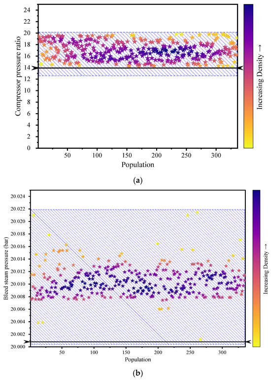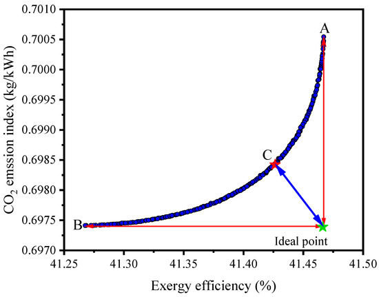 A two-objective optimization is performed to determine the best solution for the cogeneration system and to determine its optimal design parameters. The optimization algorithm is a genetic algorithm based on natural biological evolution. For this purpose, a random set of individuals is initially selected to form the initial population. The selection of individuals within each population is based on their level of compliance with the objective functions [34]. Entities exhibiting high malleability are selected for reproduction to generate the next generation. Crossover and mutation operators affect, notably, multi-objective optimization. The crossover operator has a key role in solution convergence to the optimum value. The multi-objective optimization flowchart for the genetic algorithm is illustrated in Figure 2. In this research, the “Gamultiobj” function and genetic algorithm are employed to determine the PARETO frontier via MATLAB software (version 2018). Table 4 presents the tuning parameters utilized in the optimization. Also, decision variables’ lower and upper bounds are given in Table 5 for the present optimization. Carbon dioxide EI and exergy efficiency are chosen as the criteria for optimization.