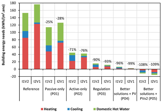 As depicted in Figure 2, the reference building presents heating energy requirements of 85 and 123 kWh/(m2·year) for the I1V2 (Lisbon) and I2V1 (Porto) climate regions, respectively. Heating and DHW account for 88 and 98% of the overall energy demands for Lisbon and Porto, respectively. The implementation of renovation packages, namely P01 and P02—representing passive-only and active-only strategies, respectively—demonstrates the potential to reduce building energy needs by 71–76%. Passive renovation (P01) contributes 25–28% to this reduction, with active renovation (P02) accounting for 46–48%. These results are consistent with existing studies, which indicate that HVAC systems can decrease energy consumption by 20–58% [40], underlining the significant role of space heating systems in reducing a building’s carbon footprint [11].