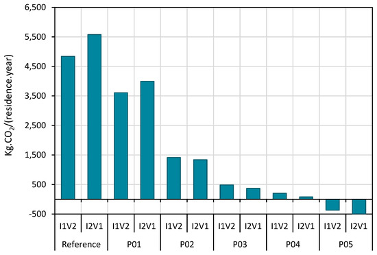 Figure 3 illustrates the annual carbon footprint of the reference building, resulting in 4500–5500 kg·CO2/(residence. Year). The application of renovation packages offers the potential to attain near carbon neutrality (P04) or even negative emissions (P05). These outcomes align with findings in the existing literature highlighting CO2 reductions of 80–96% when renovation solutions are employed to transition towards nearly zero-energy buildings [41]. Negative emissions in P05 stem from the surplus electricity generated by the photovoltaic system, which can be utilised for other building requirements, including lighting and appliances. This remarkable reduction in carbon emissions represents a significant step towards fostering sustainable and low-carbon building practices.