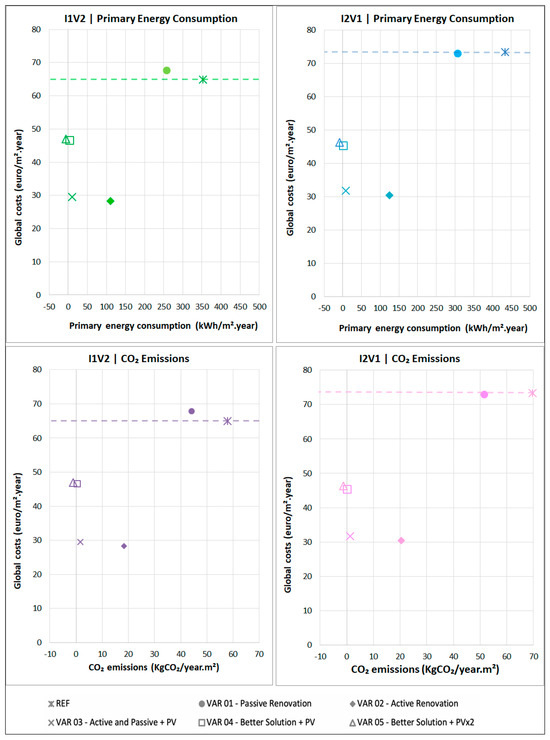 The package solely focusing on passive measures (P01) did not prove to be cost-effective when compared to the reference building due to the substantial expenses associated with solutions such as replacing windows with low thermal conductivity (U = 1.6 W/m2°C), which do not provide sufficient economic returns over their operational lifespan, totalling 67 EUR·m−2·year−1. Nonetheless, as suggested by [33], passive measures offer significant co-benefits at the building level, especially concerning indoor environmental comfort and the reduction of building pathologies such as those related to mould. Thus, passive measures must be regarded as an essential initial step in renovation projects, particularly in the Portuguese context, where addressing these issues is paramount. It is important to highlight that, for this case study, neither the order of results nor the magnitude of global costs and primary energy consumption changed for the two simulated climates. However, it is noteworthy that P01 (passive-only solutions) was not cost-effective for I1V2 (Lisbon) but approached the cost-effectiveness threshold for I2V1 (Porto), characterised by colder winters, where insulation is more critical to reduce thermal losses [42,43].
