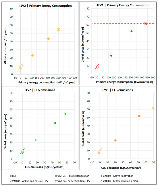 Figure 4 presents the results of the cost-optimal assessment from a private perspective, portraying the results for the five distinct energy renovation packages. The carbon emissions results correspond to primary energy consumption, following the same hierarchy from the smallest to the largest environmental impact of each renovation package.