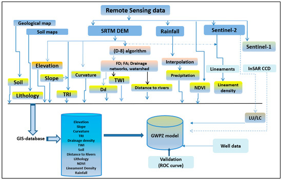 The current research used RS data and GIS techniques to disclose the prospective areas of water resources. Integration of multi-criteria such as curvature, TRI, drainage density, TWI, distance to river, soil, lineament density, NDVI, rainfall, etc., helped reveal possible water resource areas using remote sensing data from radar and optical sensors (Figure 2). These eleven thematic GIS maps were merged. The DEMs were made after the SRTM. The SRTM-30 m cell size of NASADEM 1arc additional WGS84 data from the SRTM was used to characterize the topographical parameters (elevation, slope, curvature, TRI) and hydrologic parameters (e.g., drainage density, TWI, distance to the river). The stream networks were delineated using the 8-D approach [62]. That is very important in generating stream-density maps, TWI, and distances to rivers [63,64,65].