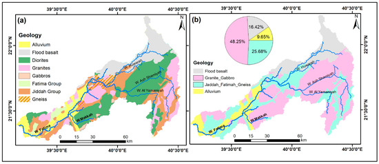 The characteristics and geometric sorts of the lithologic formations are noteworthy in controlling the occurrence, movement, and accumulation of groundwater. This is due to pore spaces [73,74,75]. For example, zones with well-sorted clastic deposits would hold water rather than massive bedrock. Based on the geologic map of the Saudi Arabian Shield (1963–1983), Wadi Fatima is built up of gneiss (ortho- and para-), volcaniclastics belonging to basaltic to andesitic rocks (Jiddah Group), metasediments to metavolcanic-including marbles (Fatima Group), gabbros, diorites, and various sorts of granites from tonalites to alkali granites either gray or pink colors. These rocks are partially covered with flood basalts (Figure 3a). Several wadis dissected these rocks and filled them with Quaternary deposits, including aeolian sand. Based on the geological map, the geologic map was simplified into four classes: alluvium, Jaddah–Fatima formation, flood basalt, and granites–gabbros that occupied 9.65, 25.68, 16.42, and 48.25% of the entire area, respectively (Figure 3b).