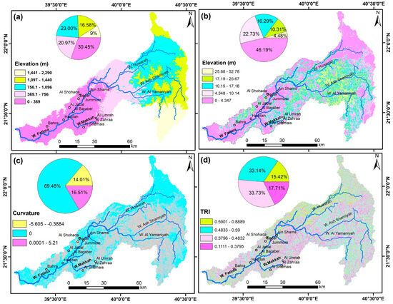 (a) Elevation; (b) slope; (c) curvature; (d) TRI.