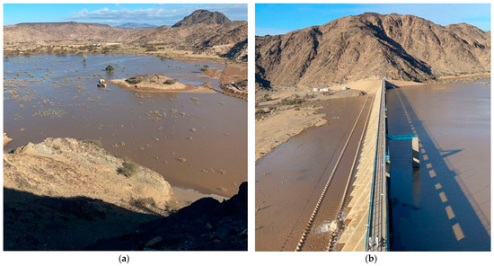 Rainfall accumulation during the rainstorm (photos taken by Majed Aloufi); (a) water accumulation in the downstream; (b) water accumulation behind a dam.