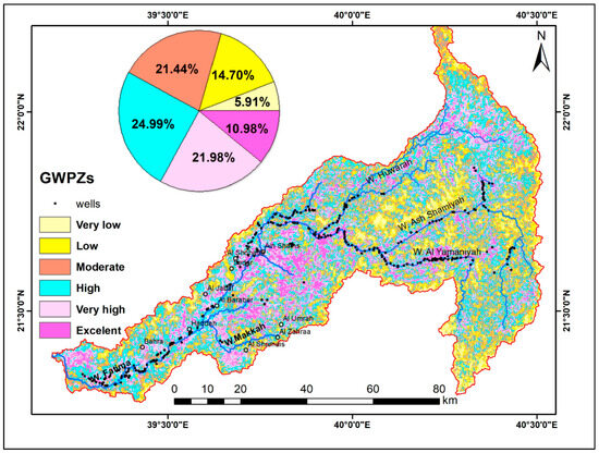 The GPZs were established by combining elevation, slope, curvature, drainage density, distance to river, TWI, rainfall, TRI, NDVI, soil, and lineaments data from satellite pictures, hydrologic and geologic. According to the likelihood of GW, the area was separated into six different zones (Figure 6). The six categories are excellent (10.98%), very high (21.98%), high (24.99%), moderate (21.44%), low (14.70%), and very low (5.91%). The region with the highest potential is now clearly visible (Figure 8). The GW recharge zones are supported with sand and gravel, depressions, and a high flat or gentle slope in this area. The gathered wells confirmed the GPZs to validate the estimated model. Additionally, places with vegetation and agricultural activities relate to good groundwater potential zones. Zones with a high slope, elevated ranges, and low density have little infiltration. Dams in this range would make it possible to capture water and protect the downstream areas as well as newly growing urban areas [103]. Zones with well-sorted sand that promote high porosity variations reveal high infiltration capability.