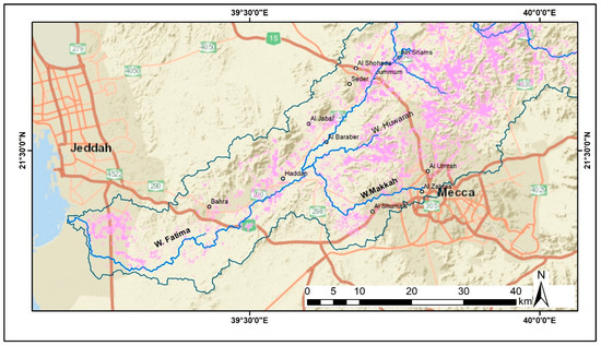 Geologically, Wadi Fatima is located within the Makkah Quadrangle; it comprises different rock units with ages ranging from the Precambrian basement complex to the Tertiary sedimentary and lavas and the Quaternary alluvial deposits. These rock formations are influenced by structural elements including fractures/fault zones. The width of the Quaternary fill deposits formed from mudstones, sandstones, and conglomerates in the study area varies from 10 m near the upstream parts to 20 m or more in the downstream parts [60,61]. Geomorphologically, Wadi Fatima and its surroundings preset 3 key parts. These rocks are the high mountainous area (Proterozoic rocks), the hilly area (dissected and weathered rocks), and the pediment plain. Wadi Fatima comprises sub-catchments like Wadi Ash-Shamiyah, Wadi Alyamaniyah, Wadi Bani Omair, and Wadi Howarah.