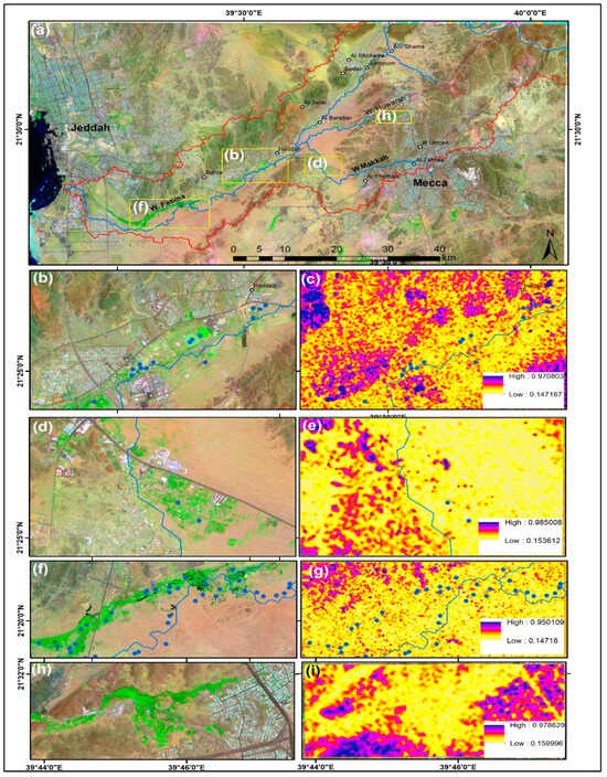 (a) Sentinel-2 12, 8, and 3 of the studied basin that is overlain with a watershed. Blue polygons explained in subfigures (b,d,f,h); (b,d,f,h) Sentinel-2 image subset; (c,e,g,i) in SAR CCD.