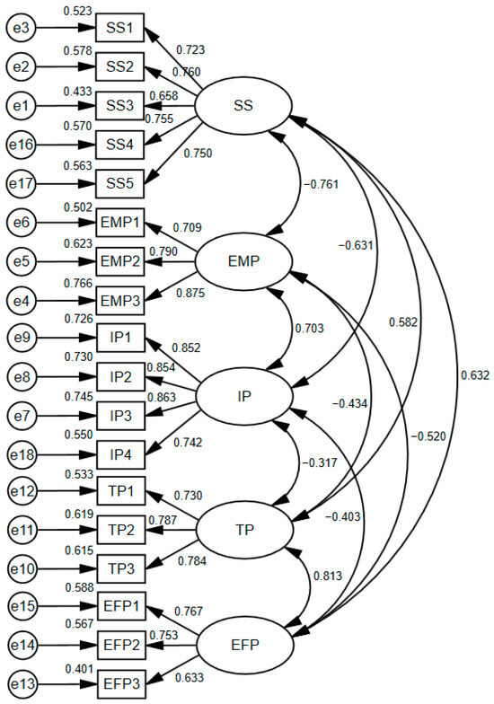 | IP → EMP → SS | Mediating effect | −0.240 | 0.055 | −0.352 | −0.143 | 50.79% |