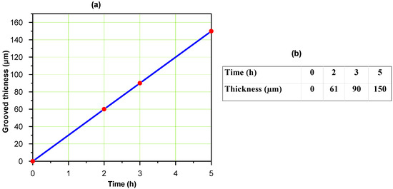 The linear relationship between etched thickness and time, as demonstrated in Figure 4a, suggests that it is possible to reasonably and precisely create grooves of different widths and depths on mc-Si. Indeed, this procedure enables grooves to be formed on mc-Si with a resolution of just a few micrometers. Such grooving is of interest due to its applications for manufacturing specific components in microelectronics, such as mc-Si solar cells with front deep contacts. In addition, the use of hemispherical grooves in applications like microelectronics engineering, micromachining, and buried metal contacts in solar cells offers several advantages. One such advantage is the ability to produce low-cost grooves on mc-Si, thus greatly reducing manufacturing costs and making these devices more accessible and affordable. Furthermore, the ability to control the groove depth based on three external parameters is a crucial feature of this technology. By adjusting these parameters, manufacturers can precisely control the depth of the grooves to meet their specific requirements. This in turn allows grooves to be customized for various applications while ensuring that the produced devices have the desired functionality and performance. These three external parameters are the solution temperature, substrate temperature, and acid vapor etching time, because they all directly influence the etching rate and depth of the grooves. By carefully adjusting these parameters, manufacturers can create grooves with precise depths, shapes, and dimensions for their intended application. Overall, the opportunity for low-cost production while ensuring precise control over groove depth makes this technology attractive for its potential to achieve innovative designs and enhanced functionality for a wide range of devices. It could, therefore, drive advancements in microfabrication and semiconductor technologies and offer sustainable development.