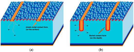 Solar cells before and after buried contact with (a) a simple metal contact form on the surface of the cell and (b) a buried metal contact form in the depth of the cell.