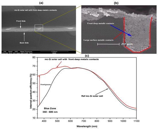 (a) SEM image of mc-Si with front deep metallic contacts, (b) SEM cross-section view of a grooved area with a front deep metallic contact, and (c) Experimental quantum efficiency of mc-Si solar cells before and after front interdigitated contact.
