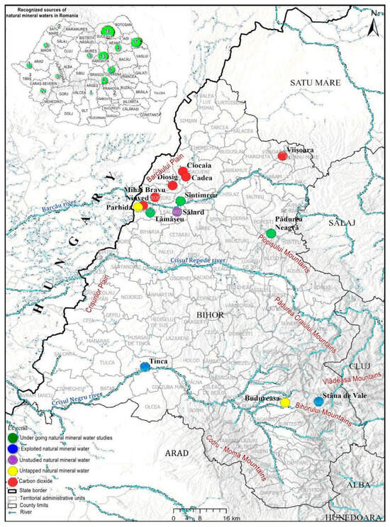 Bihor County: localities that have natural mineral water and carbon dioxide resources. In the inset—Romania and the counties that have natural mineral water resources and the number of sources recognized by the National Agency for Mineral Resources from Romania.