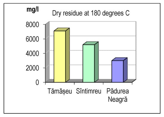 The quality of mineral waters depends on the concentration of dissolved mineral salts. Referring to this indicator, it was found that the highest mineralization (7128 mg/L) was obtained for the water of the borehole of Tămășeu in Barcăului Plain, and the lowest value was obtained for the water of the spring from Pădurea Neagră in the Plopișului Mountains (3086 mg/L) (Figure 3). According to Annex 3 to HG 1020/2005 [7] (with subsequent amendments and additions), and taking into account the content of mineral salts found, the natural mineral waters from the three localities fall into the category of highly mineralized natural mineral waters (residue content > 1500 mg/L). Highly mineralized waters are recommended to athletes and people performing physical activities at high temperatures, and are very useful to replenish the electrolytes lost through sweating.