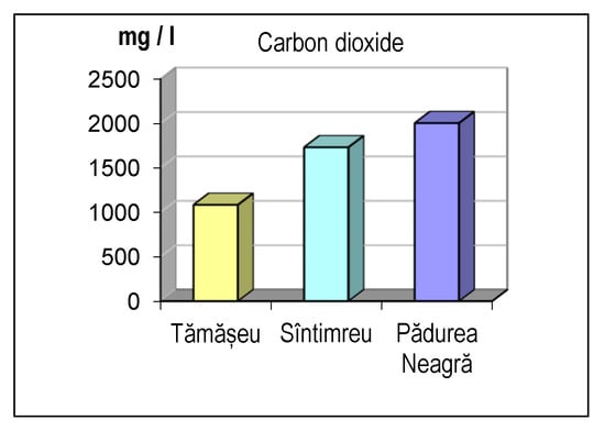 According to Annex 3 of HG 1020/2005 [7] with subsequent amendments and additions, for a mineral water to be classified as acidulated, it is necessary to have a CO2 content > 250 mg/L. Analyzing the results obtained for each mineral water, it was found that the mineral waters from Tămășeu, Sîntimreu, and Pădurea Neagră are acidulated, with the water from Pădurea Neagră spring having the highest CO2 value (2004.2 mg/L) (Figure 4). In addition, since the acidulated mineral waters from Pădurea Neagră and Sîntimreu spontaneously and visibly released carbon dioxide, they can be classified as effervescent waters.