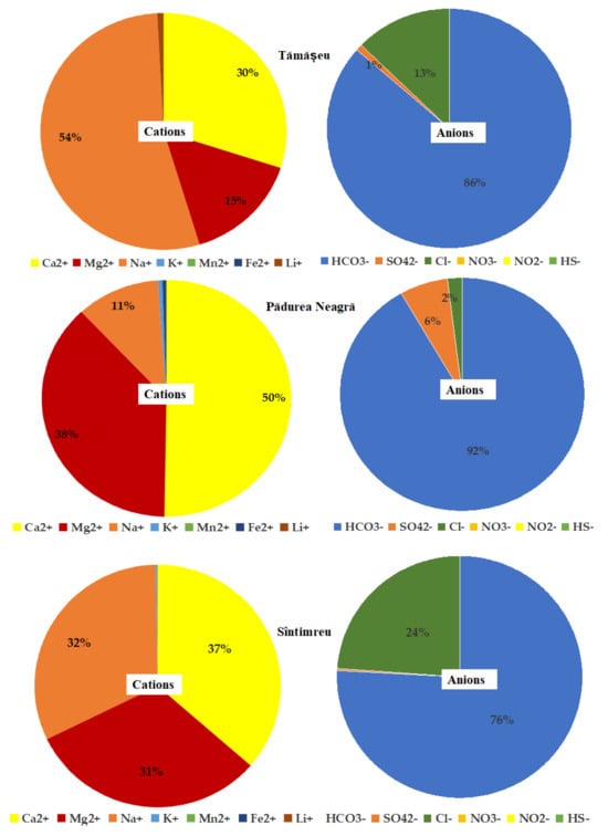 Regarding the anions, the preponderance of the bicarbonate anion (HCO3−) was found, followed by chloride (Cl−) and sulphate (SO42–) anions. The predominance of bicarbonate anions over those of strong acids (chlorides or sulphates) was found in all analyzed mineral waters. The bicarbonate ion is produced when water reacts with carbonate rocks such as limestone and dolomite. The mineral water from the Pădurea Neagră spring has the highest concentration of bicarbonate, followed by that from Tămășeu and Sîntimreu. An appreciable amount of sulphates were found in the water from the Pădurea Neagră spring (Figure 5).