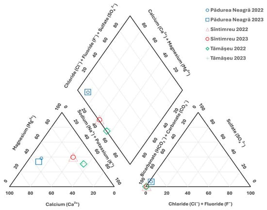 In order to classify the natural mineral waters from the three localities from a hydrochemical point of view, the predominant ions (Na+, K+, Ca2+, Mg2+, HCO3−, Cl−, SO42−) were represented on the Piper diagram (Figure 6). The diagram shows the concentrations of the majority of cations and anions arranged on two separate trilinear diagrams, together with a central diagram (diamond) in which the points from the two trilinear diagrams are projected. In the case of the mineral water from the Pădurea Neagră spring, the location is found in the quadrant represented by the majority cation Ca2+ (calcium type). The natural mineral water sampled from Sîntimreu belongs to the specific area ”no dominant type”. The natural mineral water from Tămășeu is located in the quadrant with predominantly alkaline ions (sodium and potassium type). From an anionic point of view, all three types of natural mineral waters analyzed are in the area specific to the majority bicarbonate ion (bicarbonate type) (Figure 6).