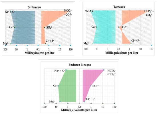 The chemical composition of mineral water, given by the specific content of dissolved salts, represents one of the main characteristics that can give it beneficial effects for health. The greatest non-uniformity in ion distribution is found in the cationic zone, where there are variations between the predominant characters of the mineral waters from the three locations. The sum of cations and anions dissolved in water, expressed in milliequivalents/liter, should be equal: (∑cations) = (∑anions). An imbalance of this equality can be attributed to errors in analytical determinations or electrolyte dissolution as a result of anthropogenic influences. The charts shown in Figure 5 give us clues about these aspects. The data presented in Figure 5 show that, among cations, calcium (Ca2+), magnesium (Mg2+), sodium (Na+), and potassium (K+) are predominant.