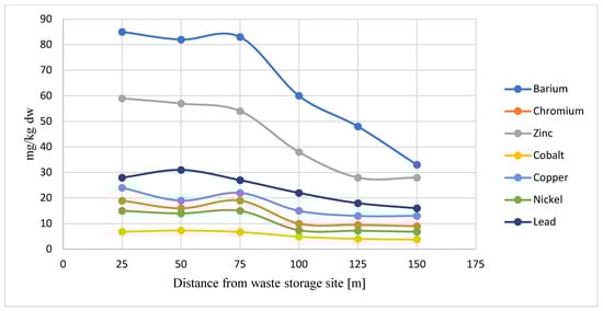 Additionally, the analysis indicates that among the substances generated at the fire site were dioxins and heavy metals. The migration of heavy metals into the environment may also lead to serious threats to human health [49,50]. Figure 9 also presents the results of benzene presence. Within a distance of up to 100 m from the waste storage site, the values of all analyzed substances no longer exceed acceptable standards. The greatest amounts of the benzo(b)fluoranthene and benzo(a)pyrene were located between 50 and 70 m from the waste storage site, 0.65 and 0.45 mg/kg dw, respectively. The lowest values in this range occurred for dibenzo(a,h)anthracene.