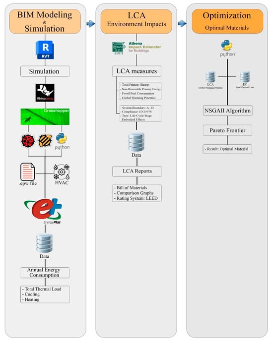 In previous research [5,8,17], there has been limited focus on multi-objective optimization techniques, and it appears that the integration of energy optimization methods with the process of BIM and LCA has received limited attention. The use of modeling software and energy consumption simulation, as well as the selection of optimal materials during the design phases of buildings, can be highly effective. In Iran, energy consumption in residential buildings is significantly higher than the global average, and modern construction methods and standards are limited. Furthermore, global standards for LCA are not adequately emphasized in Iran. Therefore, the main purpose of this article is to present a framework for multi-objective optimization by integrating BIM and LCA to determine the annual operational energy in buildings and the embodied energy in materials. This method is focused on the materials used for the external envelopes of buildings. For validation, the proposed method was applied to a case study to evaluate its accuracy and performance. The BIM model and LCA data introduce an optimal function, as depicted in Figure 1. The innovative aspect of this research lies in the emphasis on the materials used in the external envelope of residential buildings, highlighting that the selection and use of materials that effectively reduce energy consumption in buildings can reduce operational energy and lead to carbon emission reductions. The integration of BIM modeling with LCA to obtain reliable data and the use of a multi-objective optimization algorithm NSGAII to determine optimal materials for use in the external envelope of residential buildings was our main methodology. Considering the high energy consumption in Iran compared to the global average and the prevalent use of materials with higher durability but with increased energy consumption within the nation’s building, this study could provide an effective and practical approach for engineers and architects. It could significantly contribute to energy consumption reduction in Iran and other countries through influencing the selection of materials in different building components, making it a valuable step towards a more sustainable construction industry.