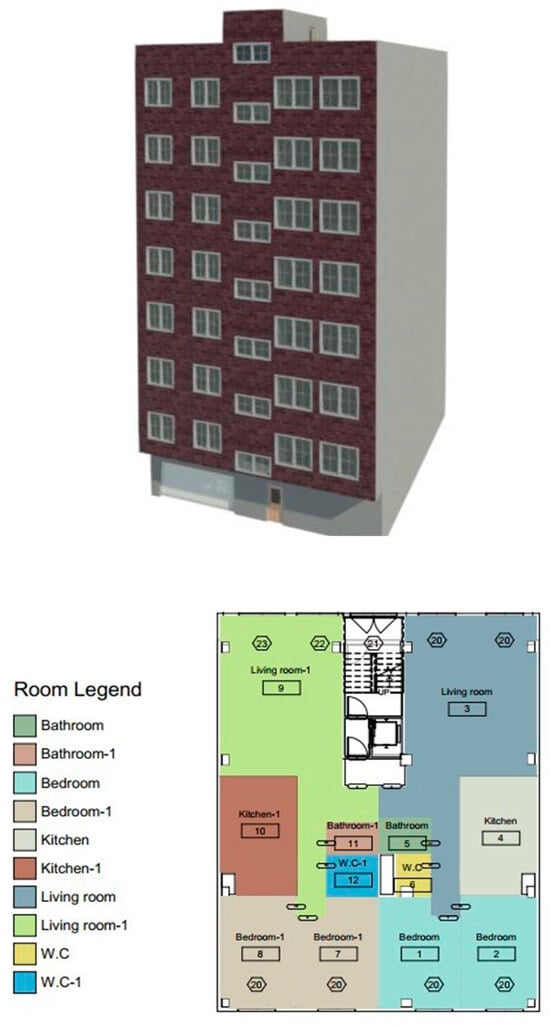 The first level of BIM involved selecting a residential apartment in Tehran. This apartment building spans seven floors, with each floor containing two units, accounting for a total of 14 residential units in a typical layout. Each floor covers an area of 230 and has north and south views, resulting in a total area of 1610 . Mid-rise buildings, ranging from 4 to 12 floors, encompass diverse architectural styles and generally house more residents compared to smaller buildings. These buildings have elevators for access. Heating and cooling systems, either centralized or separate, are also present. Some medium-sized buildings integrate energy-efficient features and eco-friendly elements such as green roofs. The building was modeled using Revit version 2022, and a 3D representation of the building is shown in Figure 3.