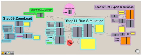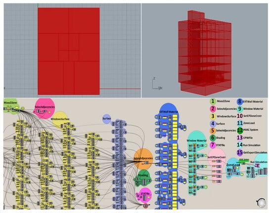 The model’s output was applied to simulate thermal zones, compute annual energy consumption, and assess building performance. In order to facilitate the energy simulation, a 3D model was imported into Rhino version 5, where the Grasshopper plugin was employed in conjunction with plugins like Honeybee and Ladybug, alongside Python programming for the development of step-by-step algorithms. The Grasshopper version 09.76.0 environment is graphical, and all the processes are conducted by stringing together geometric algorithms from its database, also making use of the ASHRAE standard library. Ultimately, this leads to the calculation of annual Energy Consumption (). Figure 4 illustrates the stages of this process.