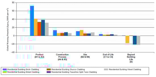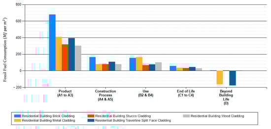 Another crucial aspect of the building’s LCA process is the comparative analysis of materials based on key components, including fossil fuel consumption () (Figure 6), global warming potential (
