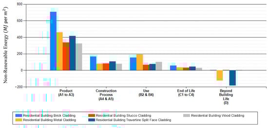 per ) (Figure 7), non-renewable energy usage () (Figure 8), and total primary energy () (Figure 9); it is worth noting that a megajoule (MJ) is a unit of energy equivalent to one million joules. The comparison involved a comprehensive assessment of five distinct facade types commonly employed in residential constructions, considering various phases of a building’s life cycle. Table 10 summarizes the comparison of global warming potential ( per ) during the optimization process (categorized by different life cycle stages).