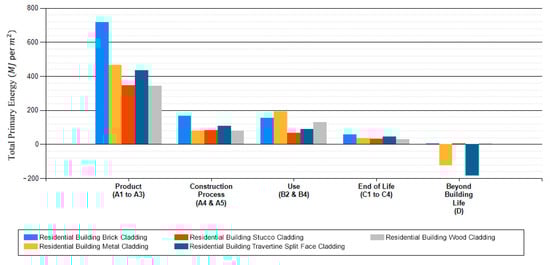 Comparison of total primary energy by life cycle stage (embodied effects) (per ).