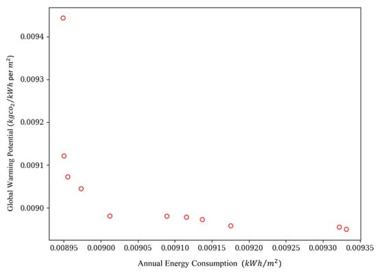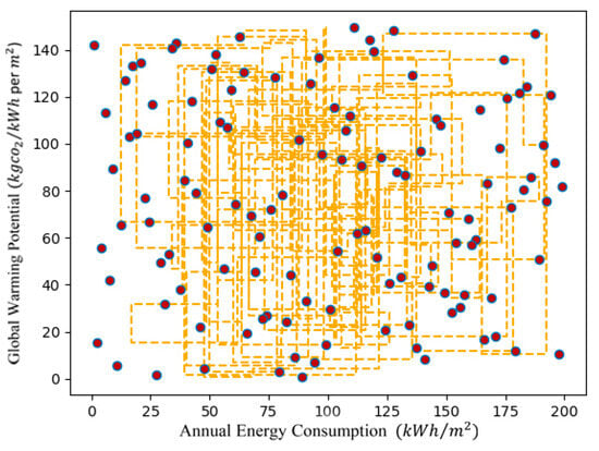 The Pareto frontier curve depicted in Figure 10 utilized data from 100 materials and details, with the x-axis representing annual energy consumption () as Function 1, and the y-axis representing global warming potential ( per ), obtained from LCA data, as Function 2, which encompasses 100 materials and details, these materials are depicted as dots, and the dashed lines representing the dominant range connect them, irrespective of how close they are within this range. These points or materials are distant from the Pareto curve and are not suitable options for optimization. To determine the most optimal materials by increasing the iterations in the NSGAII algorithm. It was observed that after 500 iterations, only a limited number of materials remained non-dominant compared to the Pareto front curve, signifying their superior performance in minimizing both functions.