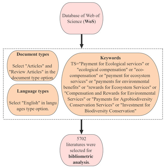 Another step involves the use of appropriate keywords to select articles from a bibliographic database. Special attention should be given to the validity and representativeness of keywords, with checking performed to assess the relevance of each study returned [21]. The literature was retrieved from 1987 to 2022. The topic search consisted of index words related to PES as follows: “ecological compensation” or “eco-compensation” or “payments for ecosystem services” or “payments for environmental benefits” or “rewards for ecosystem services” or “compensation and rewards for environmental services” or “payments for agrobiodiversity conservation services” or “investment for biodiversity conservation”. This search generated 8042 records, with articles as the document type. To eliminate “noise” in the database, that is, errors or abnormal data that might impact the results of the data analysis, the dataset was reduced to 5702 records, limited to articles and reviews after filtering other record types (e.g., editorial material, proceedings papers). The article document type records were exported to CiteSpace for further analysis.