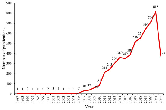 The progression of papers published related to PES during 1987–2022 is shown in Figure 2. A clear upward trend over time can be observed, indicating increasing scientific research in PES. According to Figure 2, since 2007, PES has gained significant attention from numerous researchers as a powerful tool for achieving sustainable development and effective environmental governance. A substantial amount of research has been conducted on PES, leading to an ongoing increase in the literature related to PES. As of 2021, a large amount of research has been carried out in this field; however, recently, research progress may has been hampered by the global COVID-19 epidemic, which has indirectly caused delays in academic publishing. Therefore, the number of studies in 2022 is relatively low.