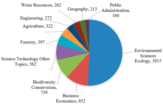 All articles covered one of 110 ISI (Institute for Scientific Information)-identified subject categories in the WoS. Before 2007, the classification of subject categories was not obvious due to the limited number of studies. With a large increase in research, the division of research directions has become increasingly significant since 2007. The top 10 subject categories include environmental sciences and ecology (50.77%), business economics (11.04%), biodiversity conservation (9.58%), science technology and other topics (7.54%), forestry (5.14%), agriculture (4.17%), engineering (3.52%), water resources (3.40%), geography (2.76%), and public administration (2.07%), which are shown in Figure 3. Since 2007, related papers have been published in 248 different journals (Figure A1), including Ecological Economics, which is the most prominent, with 2837 citations (Table A1), followed by Science (2404) and Conservation Biology (2040). Journals with a high impact factor may have a higher frequency of citations. In addition, top academic journals that publish original research in a wide range of scientific fields are included; in addition to the previously mentioned Science, there is also Nature. Science has the highest Betweenness Centralities (BC: a metric of a node that measures how likely it is that an arbitrary shortest path in a network will go through the node, which shows the contribution of a node in making connections with other nodes in a network) ratio (0.96), and its published papers have been consistently cited since 2007. Other journals with high relative BC ratios include Ecological Economics (0.86) and Nature (0.93). Therefore, these three journals are the core nodes connecting other nodes in the co-citation network of PES research journals.