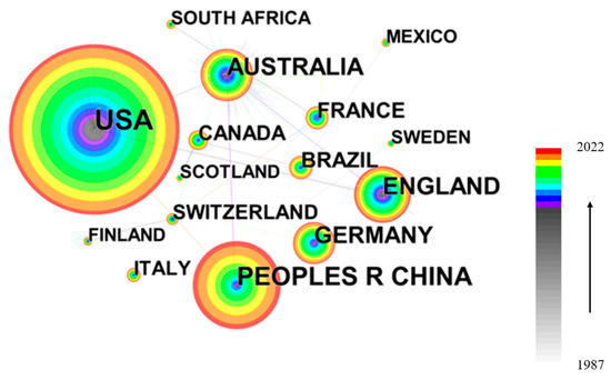In order to better show the research of PES in various countries and their connections, CiteSpace was used to analyze the cooperation between countries and form a PES national cooperation network, as shown in Figure 4. In the figure, the colors of the nodes indicate the year of publication, the sizes of the nodes represent the number of publications, the lines between the nodes represent the cooperative relationship, and the thickness of the lines represents the strength of the cooperative relationship. Table A2 lists the top 10 countries with the highest number of publications. The United States was the largest contributor, with 1484 published papers, followed by China (777). The United Kingdom ranked third, with 521 publications. Australia and Germany have between 400 and 500 articles. Countries that have produced 200 to 300 articles include Spain, France, Brazil, and Canada. Other countries, such as the Netherlands, have less than 200 articles. In general, the amount of output in each country is related to the number of research institutions, access to research funding, and the proportion of research institutions with a research focus on PES. The United States is one of the important participants and leaders in PES research and has a significant influence on the policy development and management practices of PES research. In China, one of the world’s most populous country, PES research has received the extensive attention of scholars. In order to realize the strategy of sustainable development, China has rich experience in PES research and practice, which provides numerous case studies for global PES research. From Figure 4, it can be seen that certain links (indicated by the lines representing the cooperative relationship) have been established between various countries (Australia plays a core role in the international collaboration), but the overall level of cooperation is low, and the links are weak, especially between China and European countries, which indicates that the aforementioned research gaps should be addressed further by future PES research.