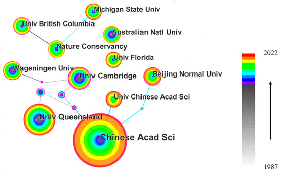 From 1987 to 2022, the Agency Collaboration Network consisted of 531 agencies and 645 collaboration segments; the institutions with a large number of publications and significant cooperation with partners are shown in Figure 5. As a market-oriented and economic approach for most countries, PES can promote the protection and restoration of the environment through economic incentive mechanisms. The maturity of the research community is relatively high, showing that the structure is relatively solid and that there are many close relationships. Table A3 lists the top 20 institutions contributing to total output. As a first-class scientific research institution in China, the Chinese Academy of Sciences has published 210 relevant articles, aiming at supporting government decision making and promoting the construction of ecological civilization based on scientific research on PES policies and practices. The other institutions with a high number of publications are the University of Queensland (126), the University of Cambridge (91), Wageningen University (78), and the Nature Conservancy (75). China has made the greatest contribution to PES research, with two institutions (Chinese Academy of Sciences and Beijing Normal University) ranking first and sixth, respectively). The United States has also produced a significant amount of research on PES.