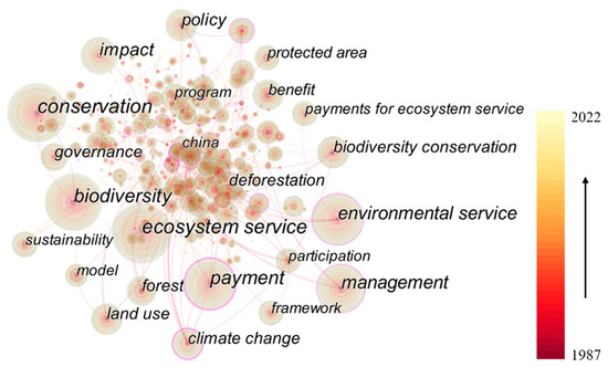 Keyword collinear analysis can accurately grasp the current research hotspots in the field and predict future research trends [68]. In this paper, a total of 491 keyword nodes and 618 connection lines were obtained. The size of nodes in the figure directly reflects the frequency of keywords, as shown in Figure 6. The most popular keywords of PES research were ecosystem service (1423), conservation (1324), and biodiversity (1029). In order to further highlight the changing trend of PES topics, we selected burst keywords to reflect the hotspots of PES research with different persistent periods of popularity and to further explore new research directions. The top 15 keywords with the strongest citation bursts are shown in Table 6. “Cost” is the earliest keyword that emerged, in 1999. From the perspective of emergence intensity, the top three keywords with the highest emergence intensity are REDD (14.89), poverty (11.75), and tropical forest (11.21). From 2007 to 2011, poverty, ecology, wildlife, REDD, and tropical forest appeared more frequently. This shows that the research has mainly focused on tropical forests, wildlife protection, and other issues related to ecosystem conservation. From 2012 to 2016, the keywords “property rights” and “market-based instruments” appeared most frequently, which demonstrates that researchers were paying more attention to social–ecological systems during this period. From 2017 to 2022, land conversion programs and ecological compensation appeared most frequently. During this period, research tended to integrate PES with biodiversity conservation and the environmental management of ecosystem services.