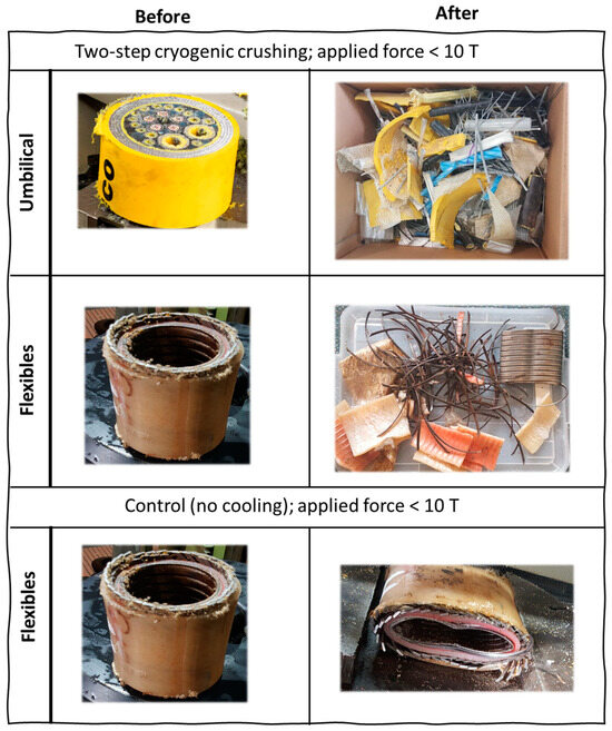 Figure 4 describes the two-step cryogenic crushing process. The first step involved lowering the specimens (i.e., flexible flowlines and umbilical cables) into a liquid nitrogen tank for a specific time based on the thermal modelling results. The cryogenically cooled materials, now exhibiting brittle characteristics, were then transferred to the hydraulic press for crushing. The controlled experiment was performed with flexible flowlines without cryogenic cooling.