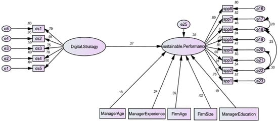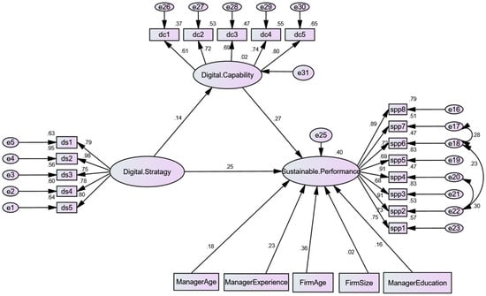 The first model (see Figure 2) was assessed in AMOS to scrutinize the influence of digital strategy on firm SCP. The results (see Table 5) substantiate H1, as they show that digital strategy had a significant influence on firm SCP (β = 0.244, p < 0.05). However, to assess the mediating role of digital capability between digital strategy and firm SCP, we ran a second structural model (see Figure 3). The results (see Table 6) indicate that the direct path of digital strategy on firm SCP (β = 0.253, p < 0.05) was significant, and the indirect effect of digital strategy on firm SCP (β = 0.033, p < 0.05) also remained significant in the presence of digital capability. This result (see Table 6) indicates that digital capability plays a partial mediating role between the nexus of digital strategy and firm SCP. These results partially support H2. The R2 value indicates that 40% variance was elucidated in firm SCP by digital strategy in the presence of digital capability along with the control variables.