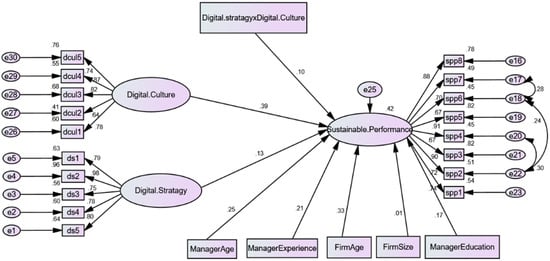To scrutinize the moderation effect, moderating analyses were performed in AMOS 21 (see Figure 4). An interaction term (DS × DCU) was created to capture the moderating effect of digital culture on the relationship between digital strategy and digital capability. The results of the interaction term of digital strategy and digital culture (see Table 7) indicate that digital culture significantly strengthened the nexus between digital strategy and digital capability (β = 0.102, p < 0.05), which substantiates H3.