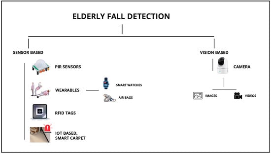 Audio-based methods for the detection of elderly falls involve utilizing sound or audio signals to identify fall events. These methods rely on analyzing audio patterns associated with falls, such as impact sounds or changes in ambient noise. In reference [], the authors state that an audio transformer model detects falls from environmental sounds with an accuracy of 0.8673. In 2020, Nooruddin et al. [] introduced a system based on a client–server architecture, adaptable to various IoT devices with internet connectivity, comprising four modules. Their linear classifier model achieved an impressive 99.7% accuracy in fall detection. In the same year, Clemente et al. [] presented a smart system designed for fall detection based solely on floor vibration data resulting from falls. This system goes beyond fall detection by incorporating person identification through the vibration produced by footsteps, thus providing information about the fallen individual. The system successfully detects fall events with an acceptance rate of 95.14%. The integration of Radio-Frequency Identification (RFID) technology, IoT, and Artificial Intelligence (AI) has opened new horizons in the realm of detecting elderly falls. This innovative approach leverages RFID-enabled sensors to discreetly monitor movements and enable real-time fall detection, addressing privacy concerns and advancing the accuracy of detection. RFID technology, known for its ability to wirelessly identify and track objects using radio waves, is applied to fall detection by embedding RFID tags in wearable devices or strategic locations within living spaces. These tags communicate with RFID readers, detecting abrupt changes in position or movements that could signal a fall event. The integration of IoT facilitates seamless data transmission from these RFID sensors to centralized systems, enabling caregivers or medical professionals to receive instant alerts and respond swiftly to fall incidents [,]. One of the primary advantages of RFID and IoT integration lies in their unobtrusive nature. Unlike camera-based solutions, RFID-enabled sensors operate without invading personal privacy, making them particularly suitable for sensitive environments such as homes or care facilities. Furthermore, this technology operates in real-time, reducing the response time to fall incidents and minimizing the potential consequences of delayed assistance. However, challenges remain in optimizing the accuracy of fall detection algorithms for RFID-based systems. Ensuring that the technology can distinguish between genuine falls and daily activities such as sitting or lying down requires advanced signal processing and machine learning techniques. In references [,,,,], by harnessing these methods, researchers have been able to enhance the sensitivity and specificity of fall detection, minimizing false alarms and maximizing the system’s reliability. The existing approaches that are used for elderly fall detection are shown in Figure 1.