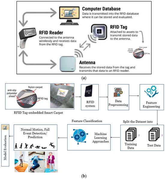 (a) RFID system and its components for elderly fall detection framework. (b) RFID IoT and AI-based elderly fall detection framework.