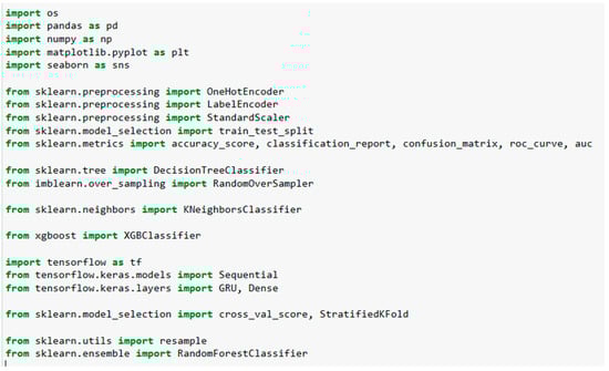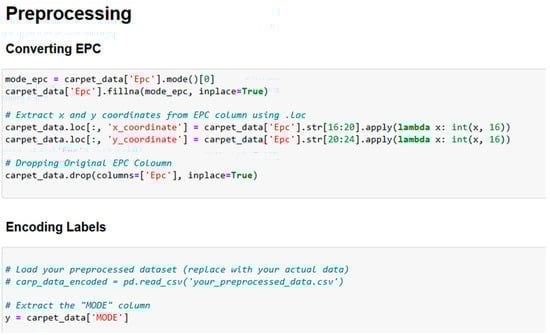 The methodology’s implementation was carried out using Google Colab, which offers a cloud-based environment for efficient computation. The implementation employed Python 3.9 as the programming language and made use of key libraries, including NumPy, pandas, sci-kit-learn, TensorFlow, and XGBoost. For data collection, participants were equipped with RFID tags and IoT-sensor data was gathered using a smart carpet. The Python-based framework utilizing Contextual Sensing Platform (CSP) techniques seamlessly integrates RFID tag data and sensor-generated movement data. Additionally, EPC-to-coordinate transformation and numerical encoding were conducted to prepare the data for machine learning algorithms. Notably, the ensemble of algorithms, which includes Random Forest, KNN, GRU, XGBoost, Gradient Boosting, and Logistic Regression, operates without fine-tuning, as shown in Figure 5 along with the libraries. The few preprocessing steps are illustrated in Figure 6 as well. The implementation exemplifies the symbiotic interaction of hardware, software, and advanced algorithms, enabling a comprehensive fall detection approach with notable accuracy achievements.