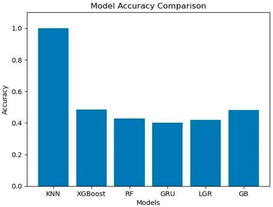 The dataset is then partitioned into training and testing sets, maintaining an 80:20 ratio to ensure robust model training and unbiased evaluation. The core contribution lies in the diverse set of classifiers employed, spanning both machine learning (ML) and deep learning (DL) domains. These classifiers include the Gated Recurrent Unit (GRU), Gradient Boosting (GB), XGBoost (XGB), Logistic Regression (LGR), K-Nearest Neighbors (KNN), and Random Forest (RF). The performance of these classifiers is rigorously evaluated considering established metrics such as accuracy, precision, recall, and F1-score to determine the most effective model for elderly fall detection, as shown in Figure 2b. The results underscore the potential and effectiveness of our proposed methodology, highlighting the synergy between wearable technology and advanced data analysis techniques in addressing real-world challenges concerning elderly well-being.
