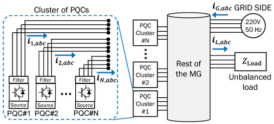 Starting from an MG with power converters that could be used as PQCs (obeying the logic behind SAPF and STATCOM), clusters of PQCs can be produced by adding communication links between units. The criteria for forming such clusters of PQCs could vary; some authors even proposed optimization methods to achieve their optimum allocation [23]. The main factor when choosing the clusters of PQCs in this case is the proximity in order to reduce implementation costs of communications. Figure 1 represents an example of the structure of a cluster of PQCs for the purposes of this work.
