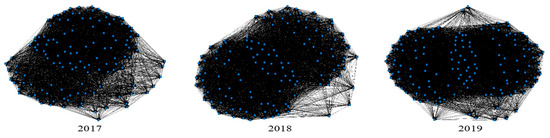 Based on the “enterprise-enterprise” alumni network relationship matrix, we used the Netdraw tool in Ucinet software to draw the topological structure of alumni network relationships for three years, from 2017 to 2019. Network nodes represent companies, the node size represents centrality values, and the line thickness represents the strength of the relationship between companies [57], as shown in Figure 1. The network diagram for 2019 features 1446 nodes, with an average degree centrality of 165.25, a degree centrality of over 353 for the top 10% of companies, and a maximum degree centrality of 846 (owing to the numerous nodes and high degree values, to make the network diagram clearer, we selected the top 10% of nodes with high degree values to draw the network diagram, and we used the data of 2019 as an example). The results indicate that these companies have a significant influence on the alumni network and are hubs for resource and information exchange between companies.