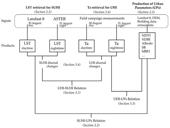 To address the research questions, this study employs air measurements from the field for daytime and nighttime that coincide with the visit time of the remote sensing satellites of medium resolution that are used to derive LST for day and night. A set of parameters that represent urban geometry, thermal properties, and anthropogenic effects of the case area were quantified as spatial data, so-called UPs. Following a flowchart of analyses (Figure 1), the relationships between Ta, LST, and UPs were explored using multivariate statistics and graphical outputs.