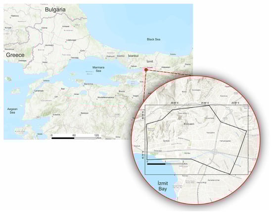 A small-scale city (population < 500 thousand), which is the most common city type across the globe [1], that has about 350 thousand dwellers and an urbanization rate of 100%, was selected as a case study. In arid to semi-arid climates, the UHI effect places more heat stress on organisms, including humans. Located in the Izmit Bay of the Marmara Sea in the northwest of Turkey (Figure 2), Izmit City has hot summers and mild winters, characterized by a transition between Csa and Cfa of the Köppen–Geiger climate classification [77]. The city has an average annual daily maximum temperature of 19.8 °C, where August is the hottest month with a long-time average of 30 °C. The city is in the hinterland of Istanbul and is the industrial heart of Turkey, with ports connected to major highways and railways. Due to the industrial activities and migration in the last several decades, Izmit has been subject to rapid urbanization that has produced many environmental challenges, including the Urban Heat Island effect.